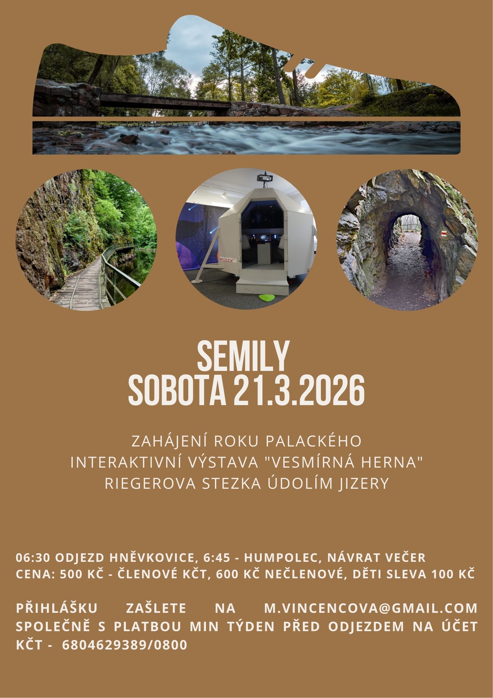 Přihlášku zašlete na m.vincencova@gmail.com a to včetně platby nejpozději týden předem na účet KČT – 6804629389/0800. Platby v autobuse nejsou možné. Pokud na akci nepojedete a oznámíte toto méně než 7 dní před odjezdem, musíte si najít náhradníka, jinak vám peníze nebudou vráceny.